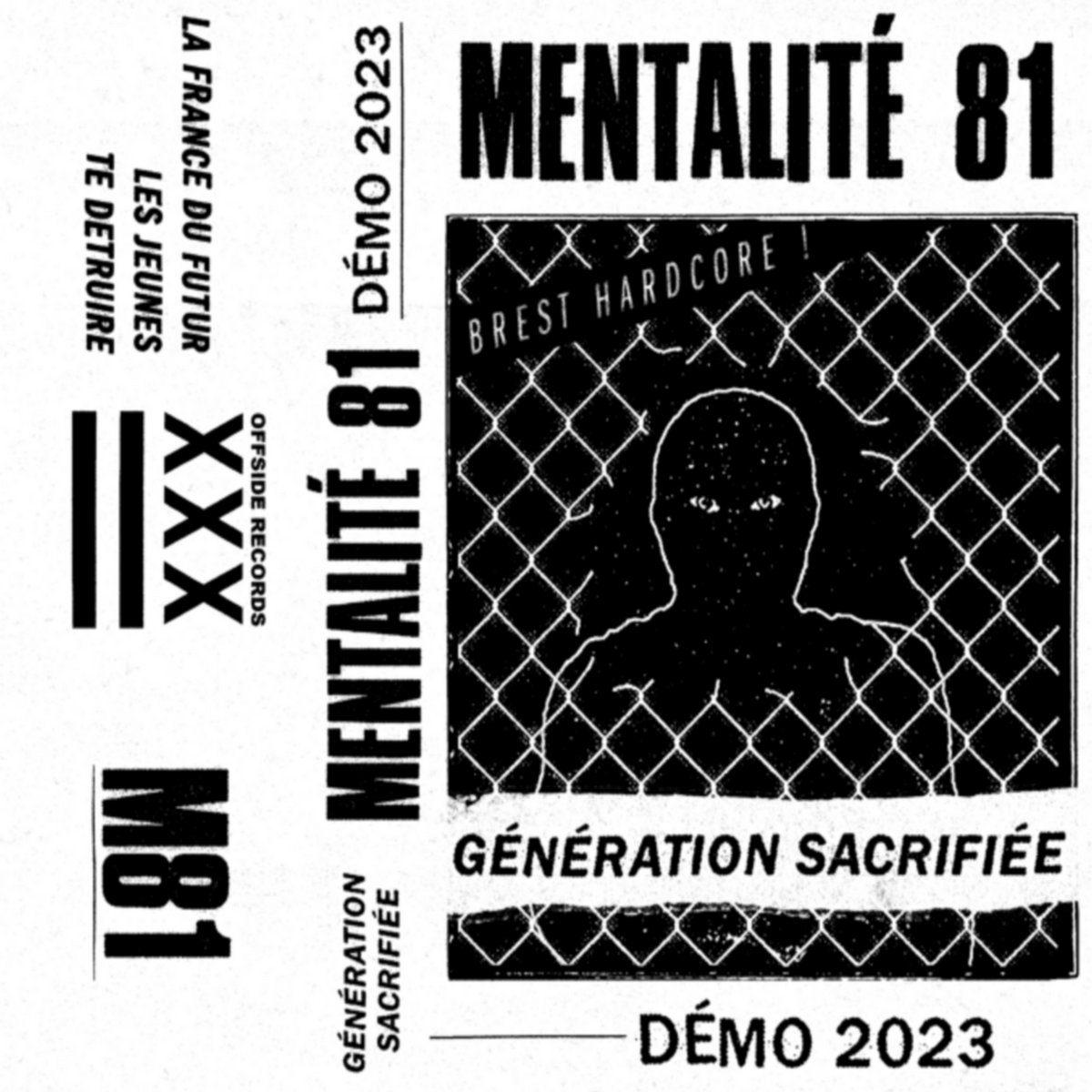 The band Mentalité 81, from Brest, is composed of Jacky and Fab. Recorded in a hurry, in only two days, this demotape contains three incisive and angry tracks in the vein of the fast tracks of Syndrome 81. The first track "La France du Futur" draws up an alarming report of our current society and its evolution, while the second track "Les Jeunes" highlights the current youth and its difficulties with the refrain "Génération sacrifiée" which gives its title to the demotape. The third song, "Te Détruire", deals with the difficulty of seeing a loved one sink into self-destruction, and is a call to action for a society that seems to turn its back on its most vulnerable members. This demotape is sure to please any fan of hardcore punk and meaningful music.